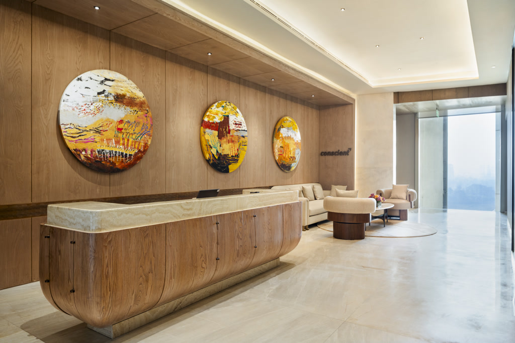 Perched on the fourth floor of the Grand Hyatt Tower along Golf Course Extension Road, Gurgaon, the Conscient Infra Sales Lounge is conceived as a dual-purpose environment — simultaneously an experience centre and a functioning workspace. Designed by Studio IAAD, the project responds to a brief that demands adaptability without compromising spatial clarity.