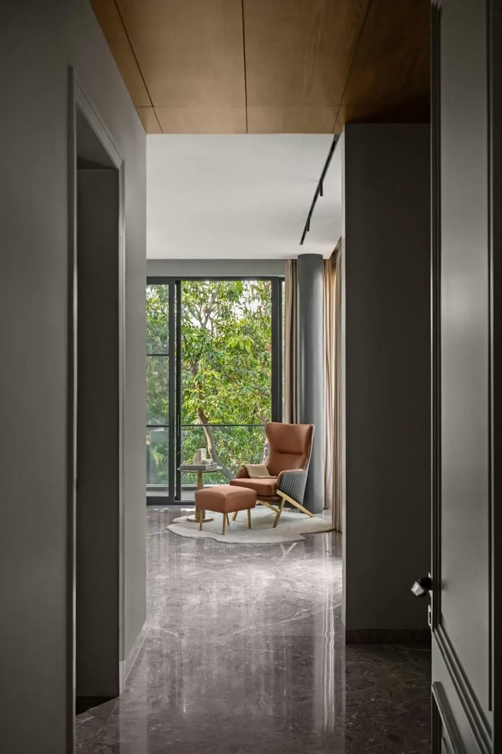 kArchitecturally, the residence adopts a contemporary language defined by clean lines, balanced volumes, and a restrained palette. A mix of modern materials – metal accents, glass, wood, textured paint, and stone – adds depth without visual excess. Stone finishes are treated with particular care, introducing subtle variations in texture that lend character to the overall composition. The façade is finished in a muted grey tone, softened by the warmth of natural wood elements, creating an exterior that is understated yet distinct.
