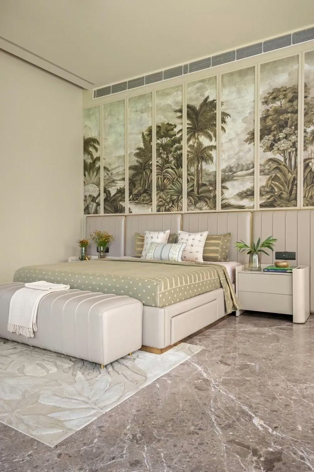 Subtle outdoor elements, including a small installation visible from the room, enhance the sense of calm and connection to nature. Family lounges feature curated artworks, while a blue-toned pantry acts as a visual link between shared spaces. Other bedrooms incorporate botanical wallpapers, bespoke furniture, and soft tonal variations to create personalised yet cohesive environments.