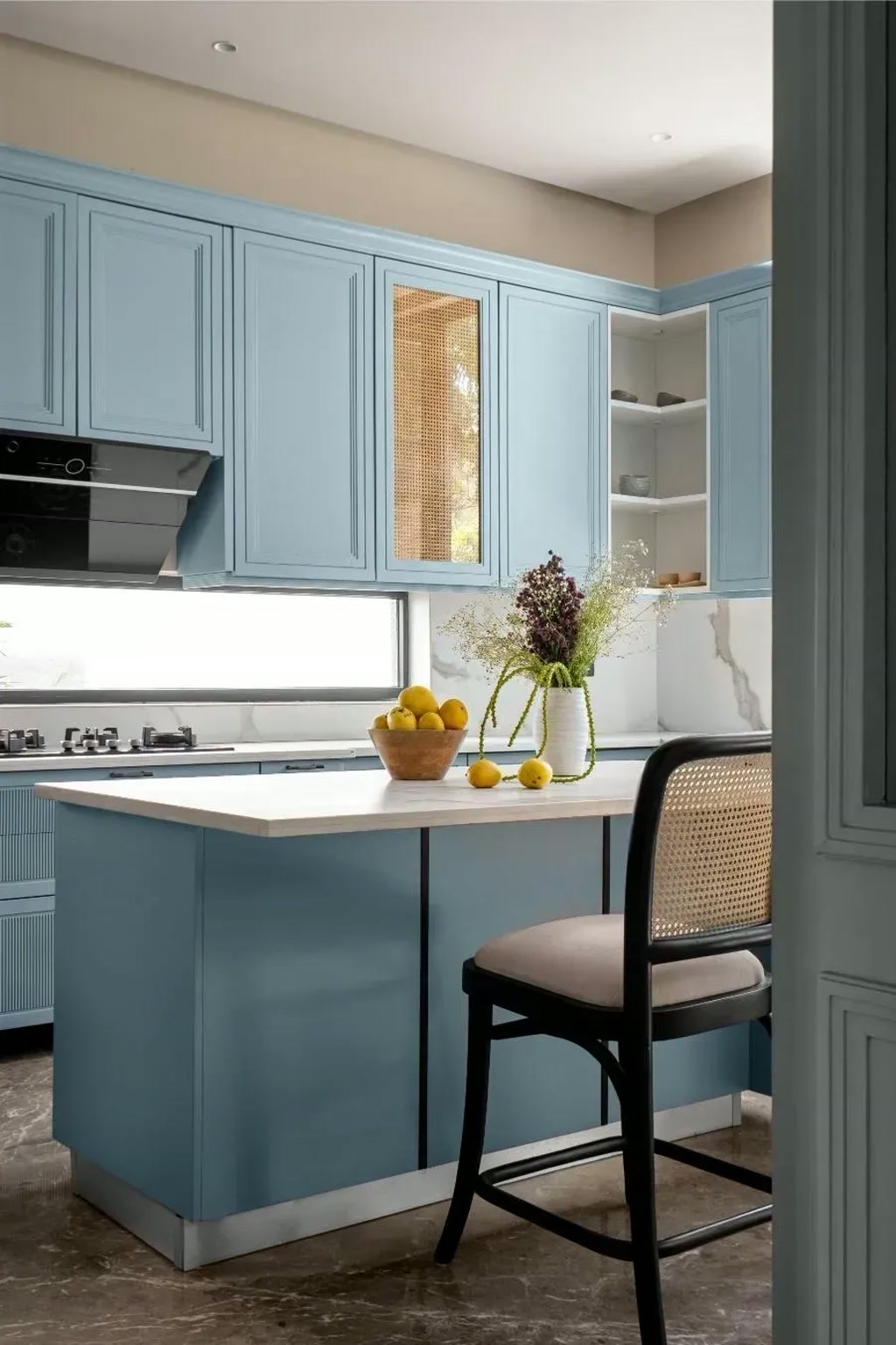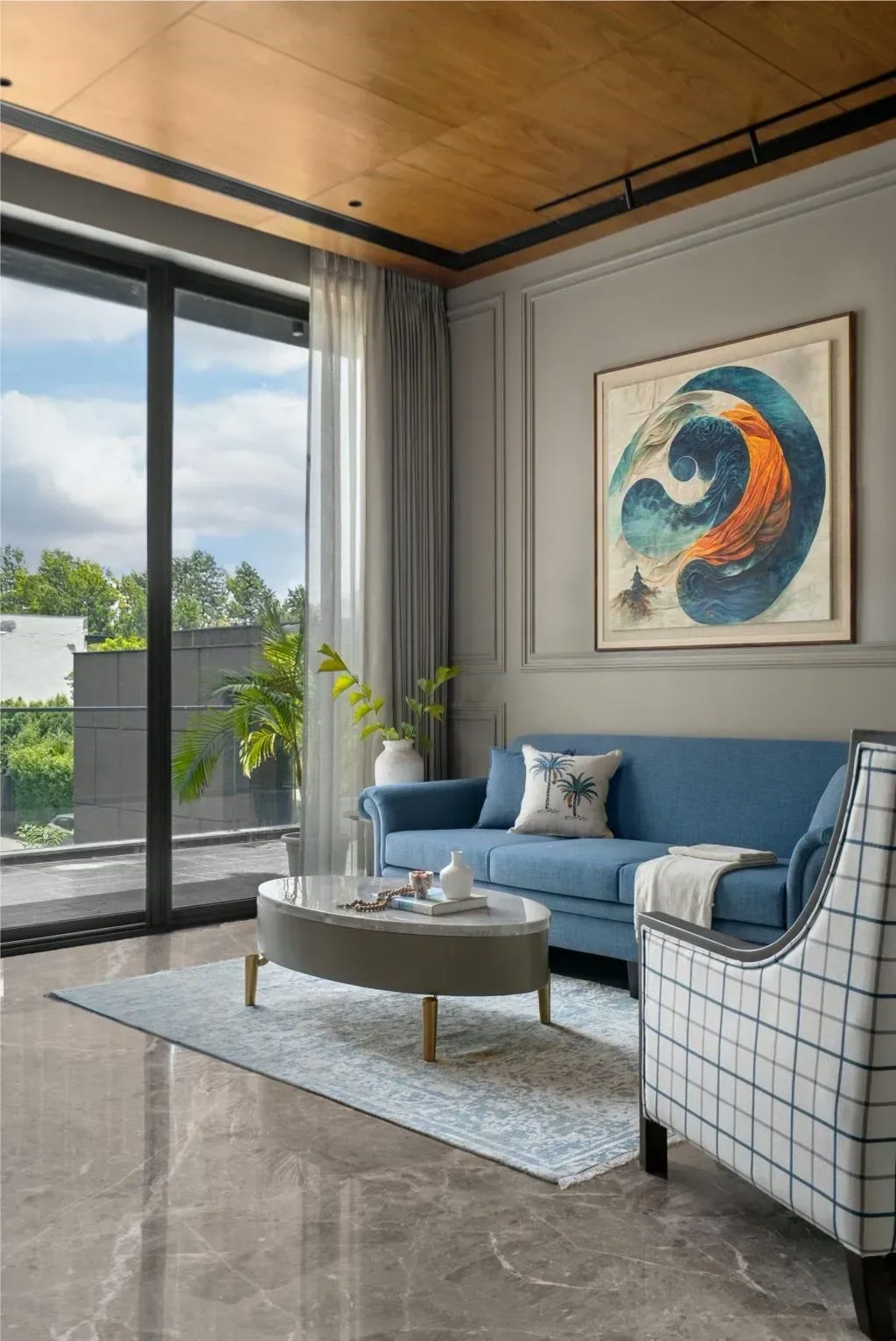 Interiors across the home follow a consistent yet layered material approach. Marble surfaces and detailed wall panelling form the base, while selected areas incorporate high-gloss finished panels that add a refined sheen. Grey remains the dominant palette, complemented by blue accents that flow through furniture, soft furnishings, and select architectural elements. Locally crafted furniture adds a sense of authenticity while supporting a more sustainable design approach.