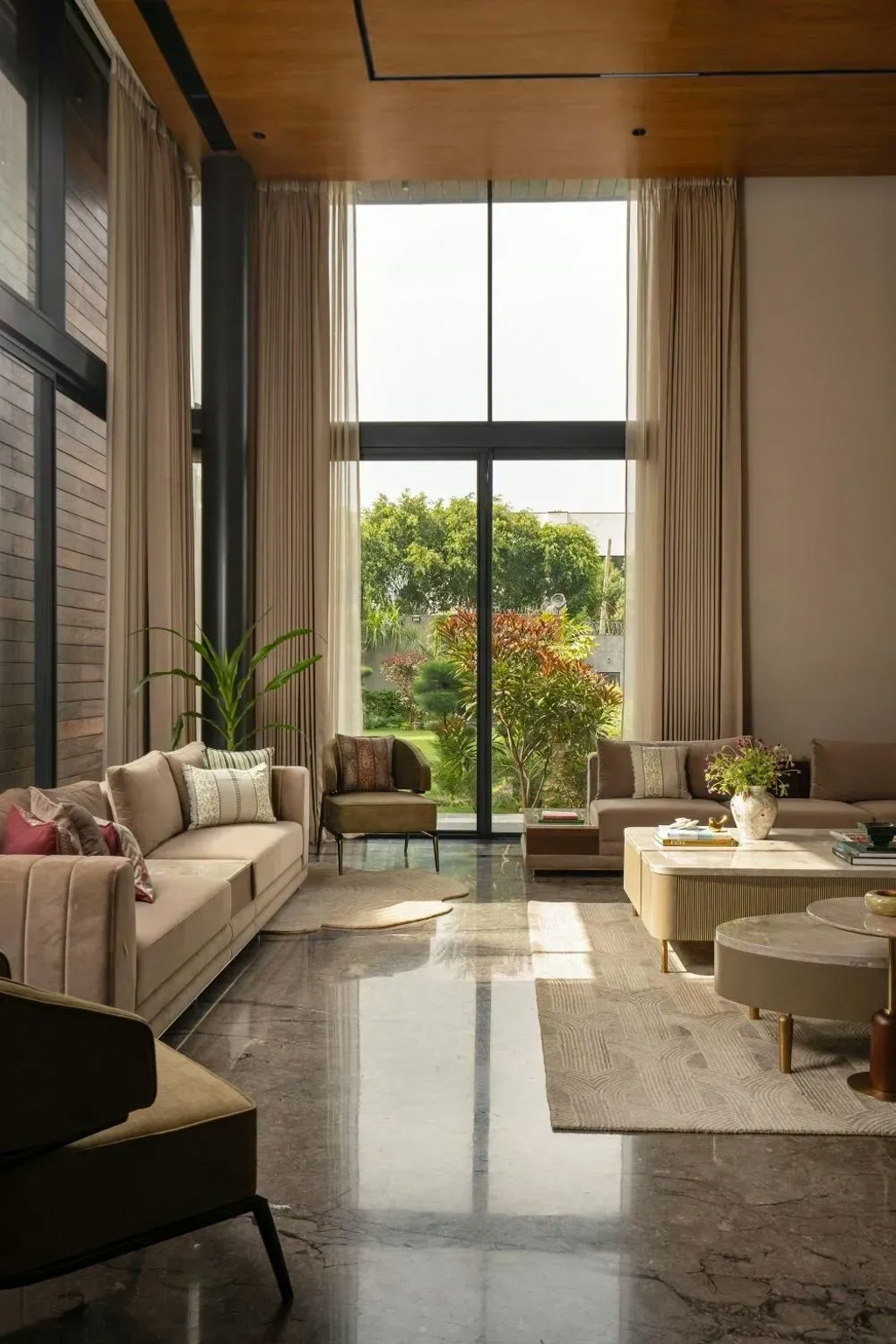 Upon entry, the double-height living space establishes the home’s spatial character. Floor-to-ceiling windows frame views of the outdoors, while neutral tones and wooden ceilings reinforce a sense of warmth and openness. A minimal staircase positioned toward the south introduces vertical movement without interrupting visual continuity. Carefully placed accents, including sculptural elements in restrained colour tones, add subtle contrast to the otherwise calm palette.