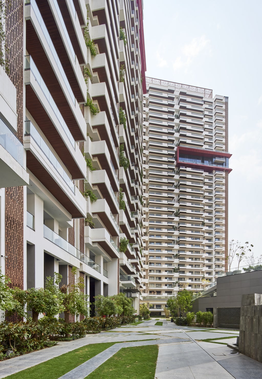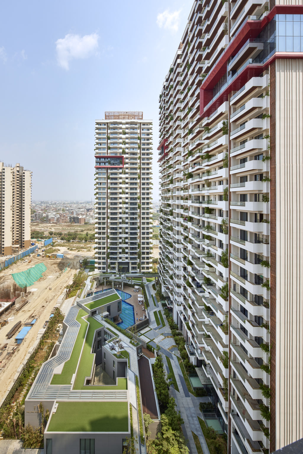 Luxury here is located in what money typically cannot buy within a high-rise: privacy, open sky, and the tactile presence of nature. Every apartment has a private deck — 10 to 12 feet wide, 40 to 50 feet long — that functions as an outdoor living space instead of a typical balcony. The three trees per unit extend this further, creating a green canopy that also acts as a natural air filter and shade element. At the upper end, the duplex penthouses on the 22nd floor are articulated as the “Red Box” — a bold, visually distinct volume with double-height living spaces and unobstructed views of Sector 47 Central Park. The entire proposition rests on a single idea: that a resident in a 30-storey tower should be able to step inside their front door and feel they are in a bungalow.