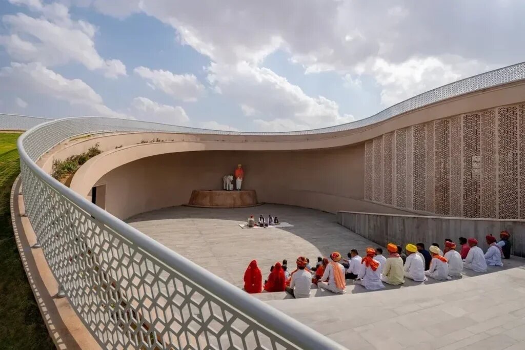 In the heart of Rajasthan’s Nokha district, 144 villages intertwine. Fueled by studies of the area’s needs and existing facilities, the clients were keen to have a community center that embraces all ages. The center is a sweeping curvilinear volume, gracefully rising from the northeastern corner, looping around the site to culminate in a north-facing open courtyard.