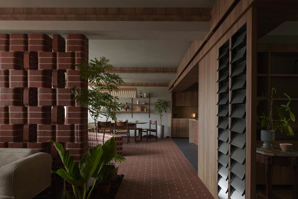 The rounded profile of the brick introduces a softness that contrasts with the typical rigidity of domestic interiors. It allows surfaces to curve, edges to ease, and boundaries to loosen. A freestanding brick wall subtly divides the study from the living area, not as a barrier, but as a porous threshold. Between the study and dining spaces, a curved bench emerges — shared, accessible from both sides, and open to occupation. These gestures resist compartmentalisation, encouraging movement, overlap, and informal use.