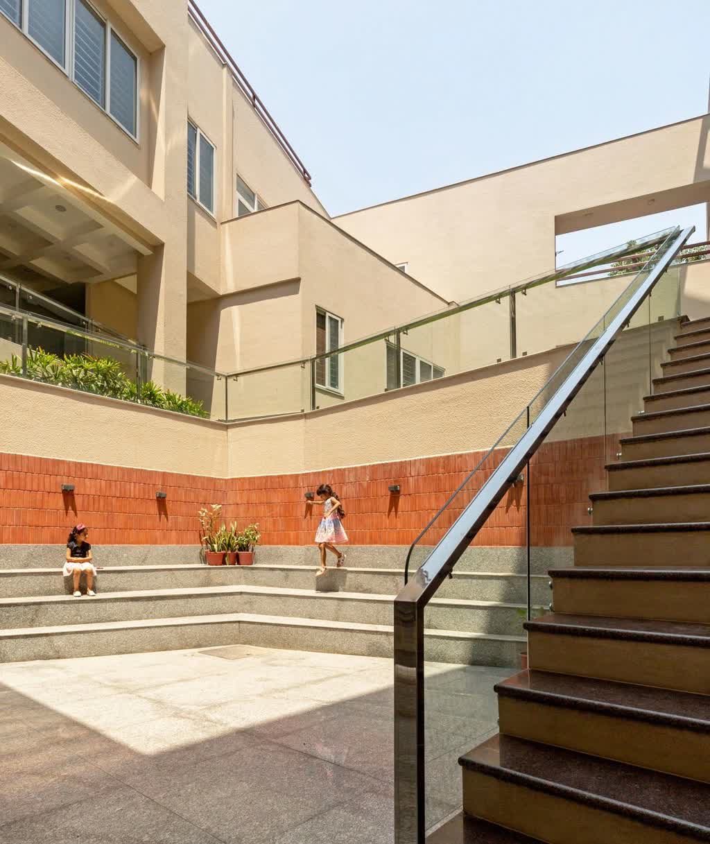 The central courtyard is precisely aligned in the North West – South East direction to catch the south-westerly winds during the monsoon, thus ensuring ventilation throughout the building. Bricks jaalis are used as partitions between the central courtyard and the peripheral area for ventilation and for the seating in the corridors and the play area.