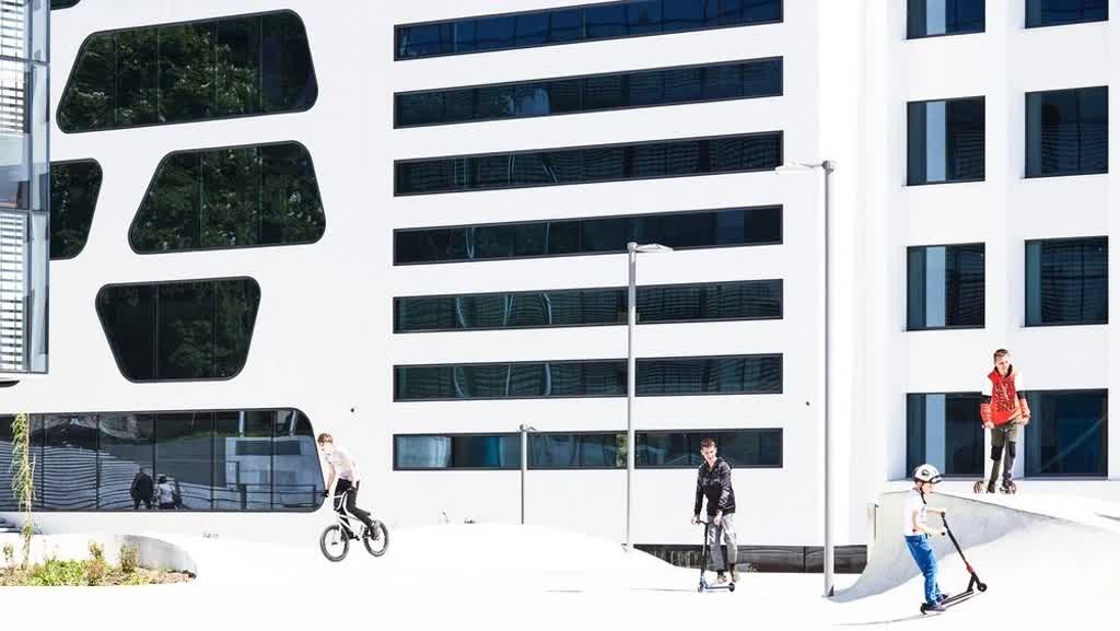 An artificial stream meanders through the organic concrete landscape with wooden islands, inviting visitors to linger and play, while an interactive fountain installation enlivens the large, flat open space in the square, which can also be used for events, festivals and markets. The investor funding the transformation of the square is a passionate skateboarder and wanted to offer skate enthusiasts a new home in the city, hence large parts of the square are laid out to be skater-friendly too. Specialists in skate park construction were therefore brought on board to help realize the challenging free forms developed by 3deluxe. Another addition, lying opposite the new corner building, is a modern amphitheater, and the frontage facing it can be outfitted with a giant LED screen for public viewings when required.