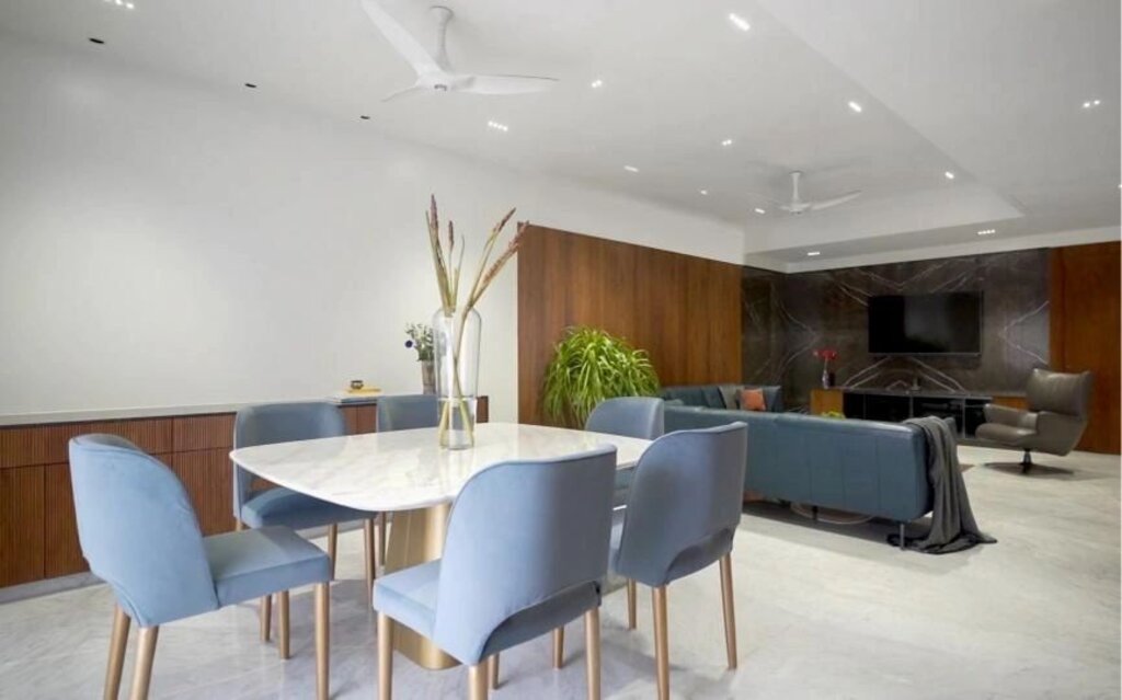 The project faced challenges due to its location in a prime residential area enclosed by walls on three sides, which initially limited natural light and ventilation. To overcome this, significant civil interventions were undertaken, including breaking down south-facing walls and incorporating balconies to usher in natural light and promote cross ventilation. These architectural modifications have transformed living spaces, flooding them with sunlight and fresh air, and enhancing both aesthetic appeal and functional use with seamless indoor-outdoor transitions.