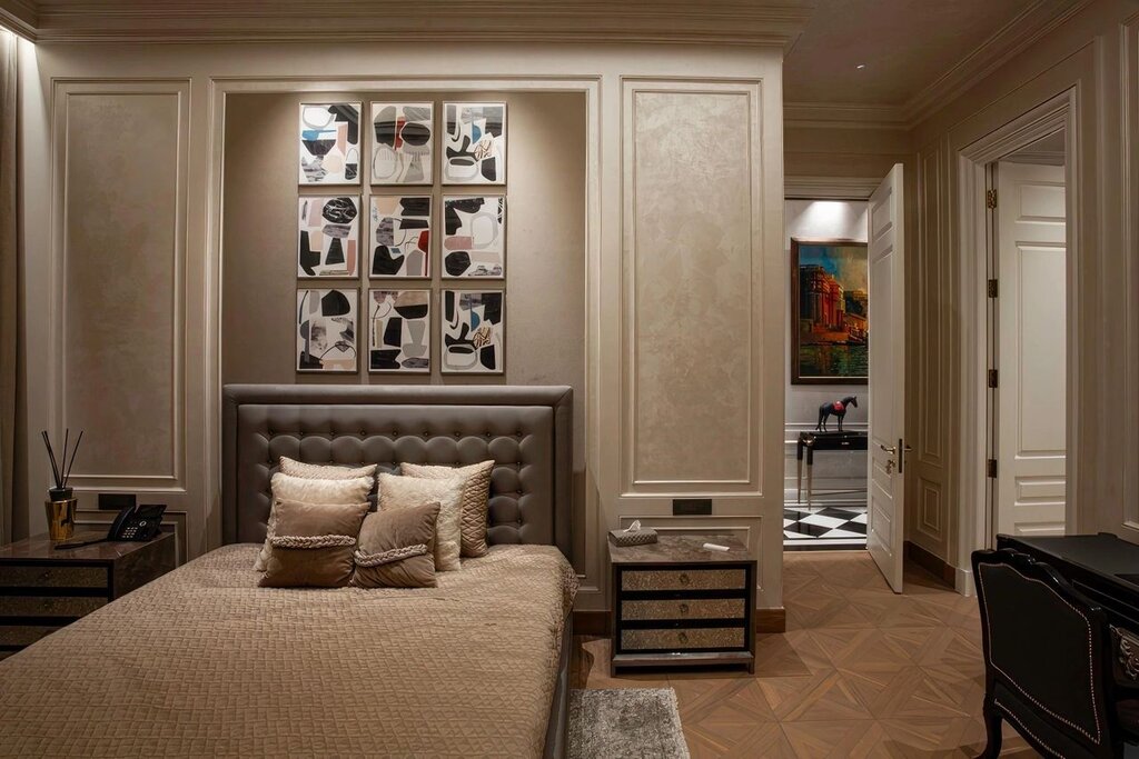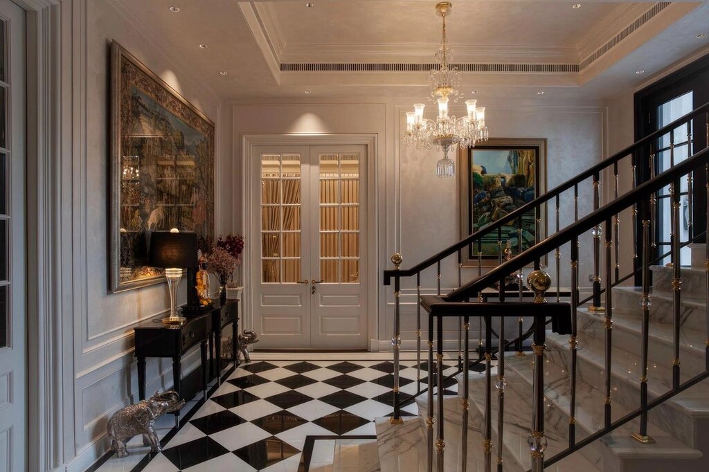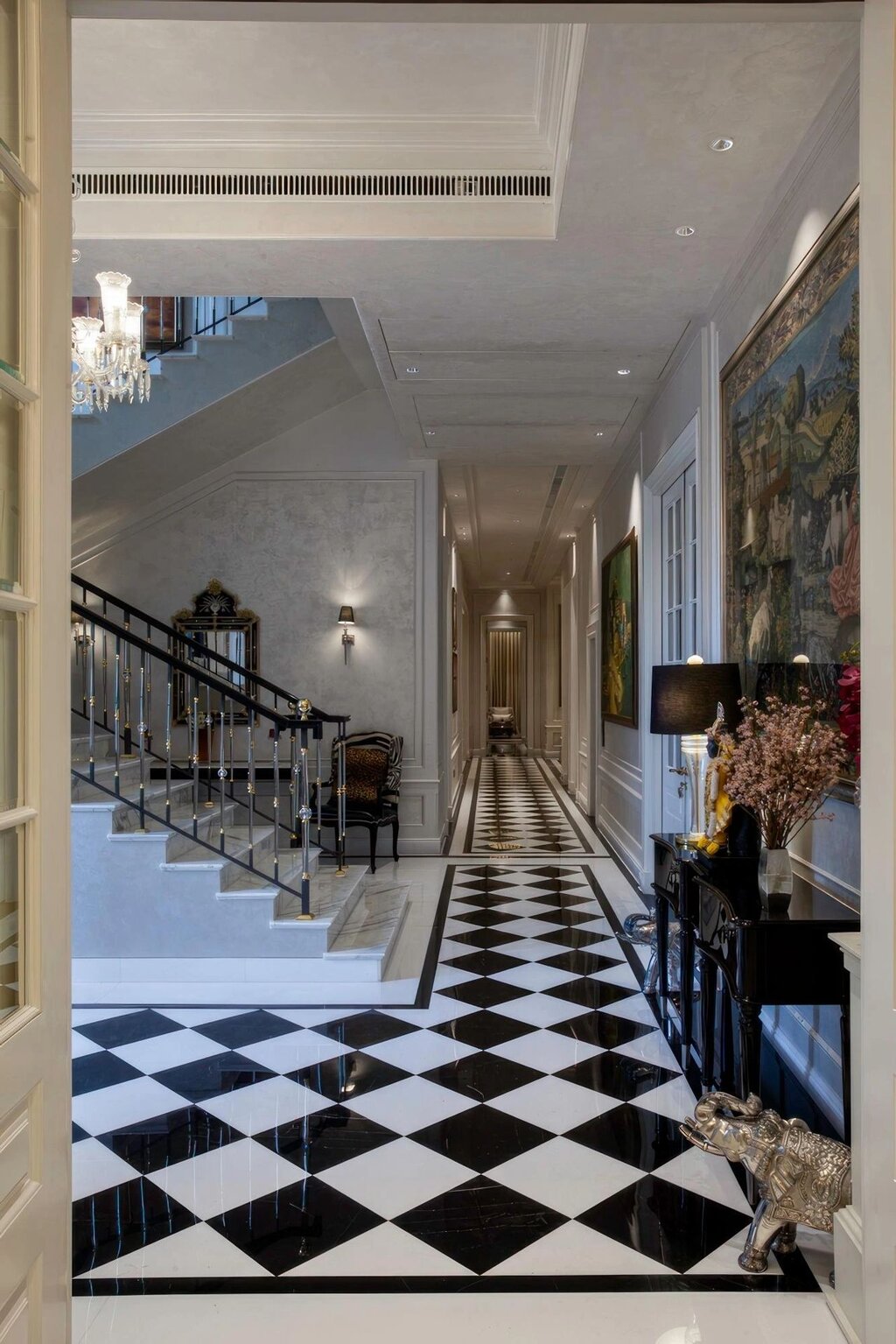Each room tells a story through handpicked art and artefacts, meticulously curated to enhance individuality while contributing to the villa’s cohesive aesthetic. The staircase, adorned with gold accents and chequered marble floors, serves as a striking focal point, embodying the villa’s sophisticated character.