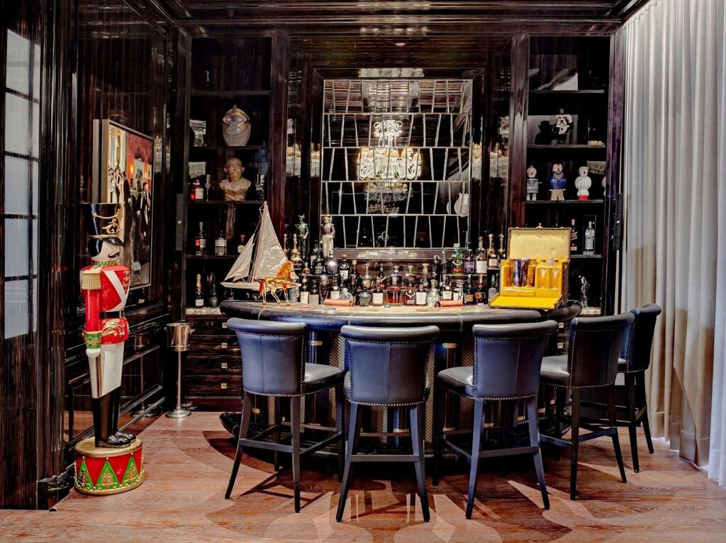 The bar room offers a sophisticated escape, distinct in its warm wood tones, plush upholstery, and an intricately designed state-of-the-art bar. This retreat contrasts the villa’s overall design while maintaining a cohesive elegance.