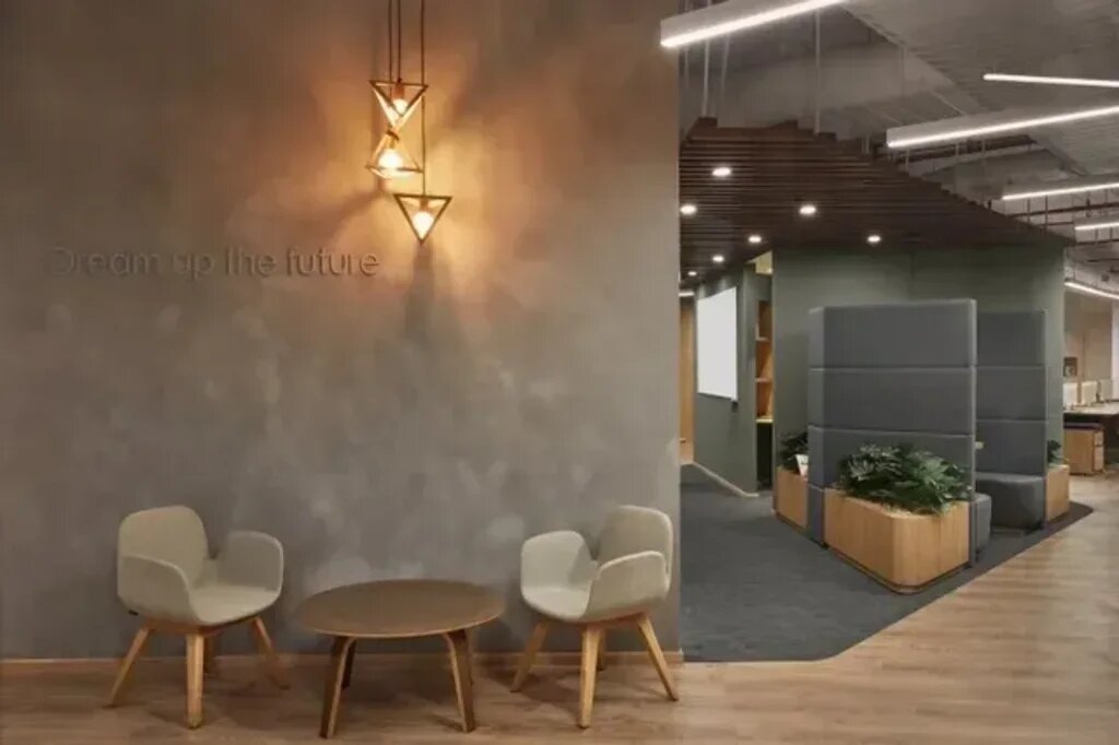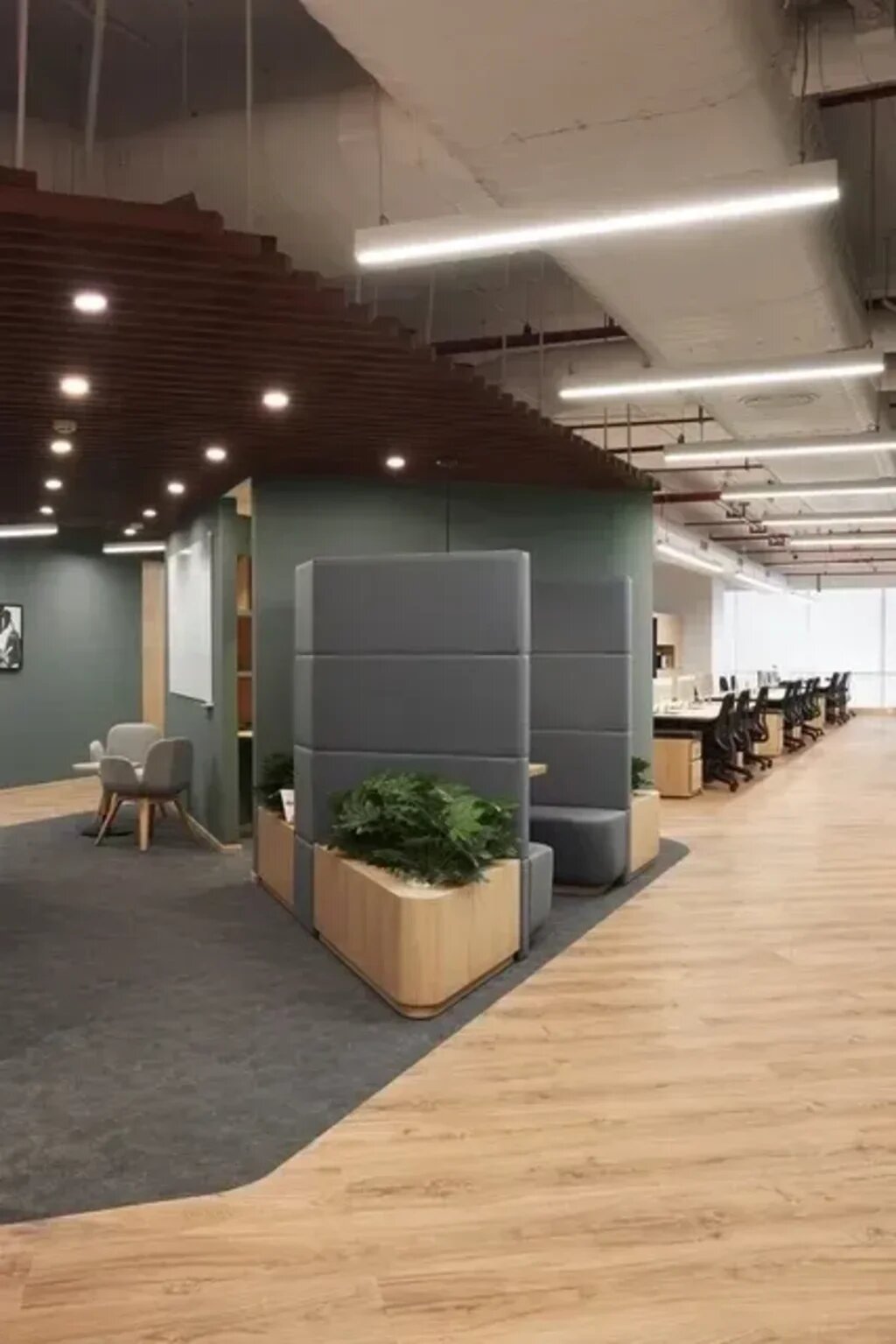 Throughout the entire space, the carefully chosen colour and material palette bring in the soothing effect while enhancing the working environment. An amalgamation of natural materials like wood and concrete finishes with soft hues of green surrounded by planters forms the common theme at Nomura and helps create an oasis of a chic and cosy workplace.