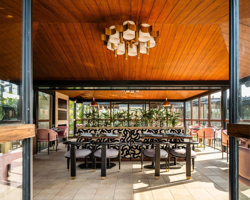 Ascending to the open rooftop, visitors are greeted by a botanical haven inspired by greenhouses and opulent cabanas. The design is dominated by pastel hues, exuding elegance and warmth. Long seating benches highlighted with vibrant accents, granite tables featuring intricate groove details, and rustic pastel cutlery contribute to a visually enchanting dining experience.