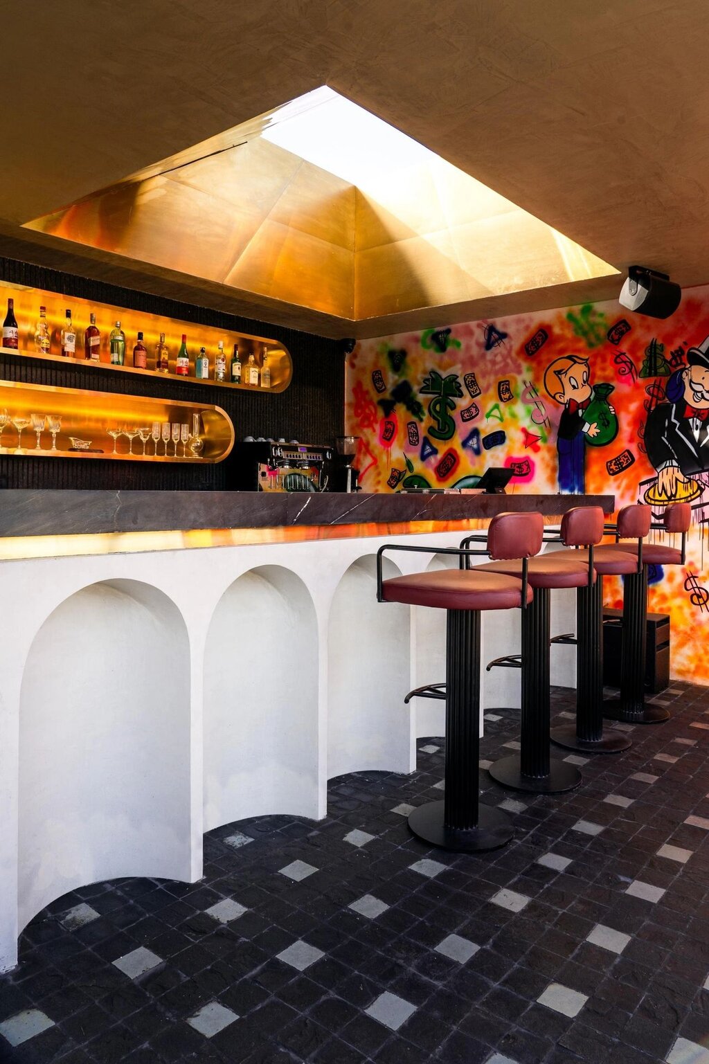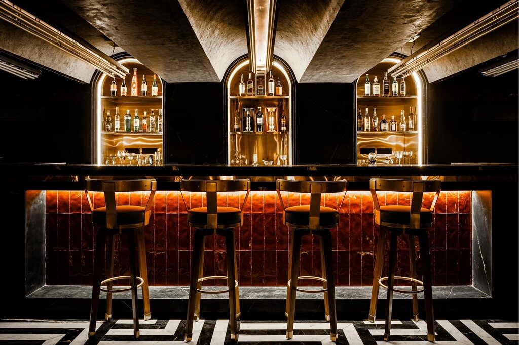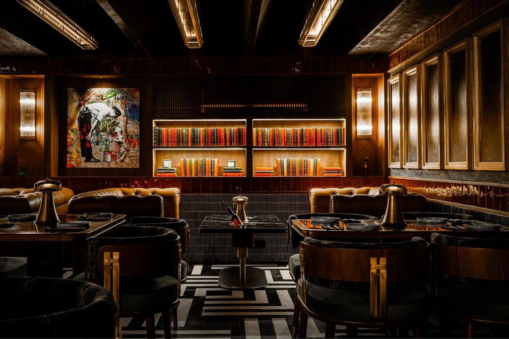 Hidden behind a cleverly disguised, artwork-framed door lies the speakeasy – a captivating counterpoint to the rooftop’s vibrant openness. Dark and mysterious, the speakeasy evokes the glamour of yesteryears with contemporary sophistication. Brass finishes, handmade tiles, marble inlay flooring, and intricate detailing set the stage for an intimate and refined atmosphere. Vaulted ceilings adorned with linear tube lighting enhance the sense of grandeur, while plush tan leather sofas and patterned green upholstery chairs provide luxurious seating.
