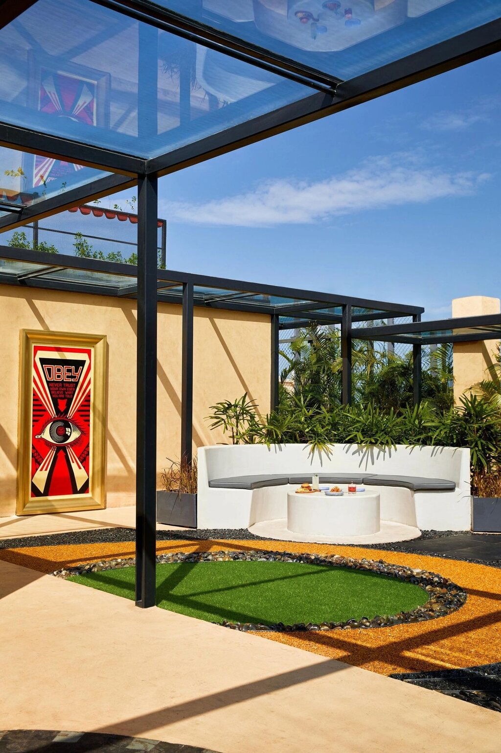 The architectural narrative is brought to life through the use of metal structures and hut-shaped cabanas adorned with glass cutouts that welcome natural light. Every corner of this rooftop paradise is infused with botanical charm, creating an environment that feels both luxurious and grounded in nature.