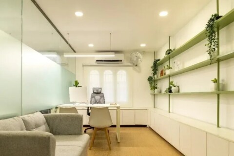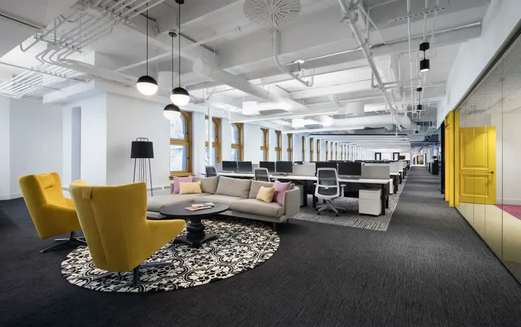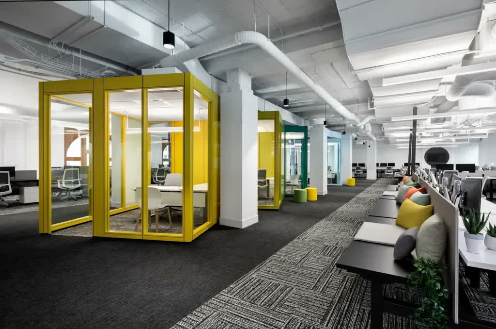 Among the most striking elements of the design is the introduction of Tailored Solution Enclosed Movable Office Walls—executive office cubes placed strategically at the center of the main workspace. These floating glass pods, framed in vivid colors, allow natural light to flood shared areas, fostering openness and collaboration. Their central position enhances visual and functional connectivity between team members while maintaining privacy and focus.