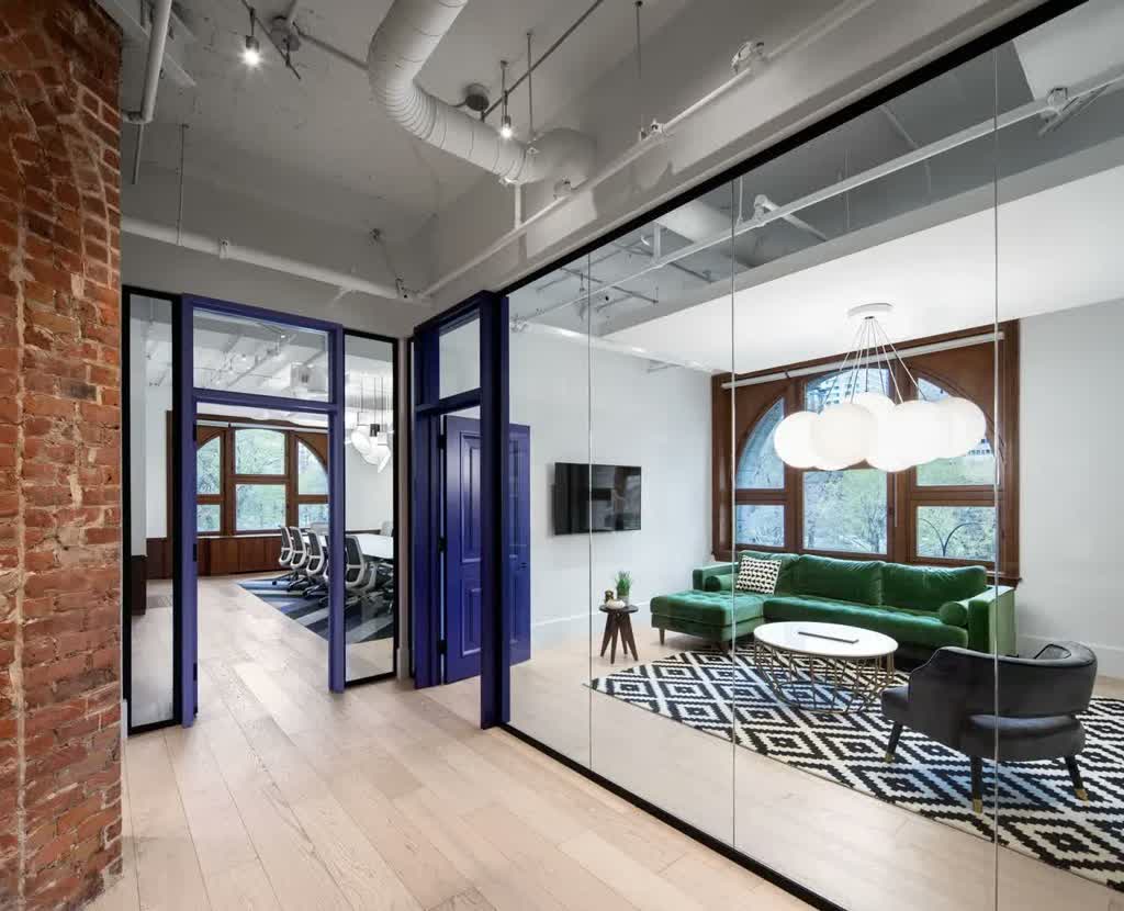 Upon entering the OneSpan office, original brick walls and arches welcome visitors into an expansive reception area. A corridor of white oak flooring—accented by OneSpan’s signature purple and lilac hues—leads into the heart of the L-shaped floor plan. To enhance scale and energy, large pivoting disc lights hang from suspended fixtures, animating the space and creating visual rhythm.