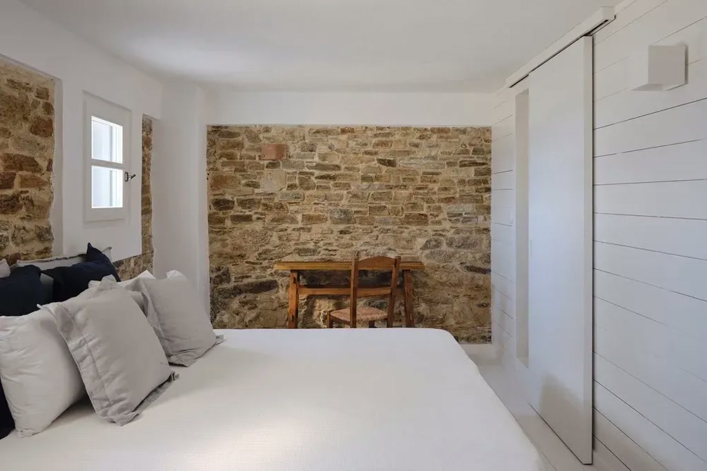 the design strategy focused on continuity rather than contrast. Existing materials were retained wherever possible and complemented by a limited palette of white-painted solid oak and Naxos marble sourced from a neighbouring island. These additions introduce clarity and lightness while remaining consistent with the regional material language.