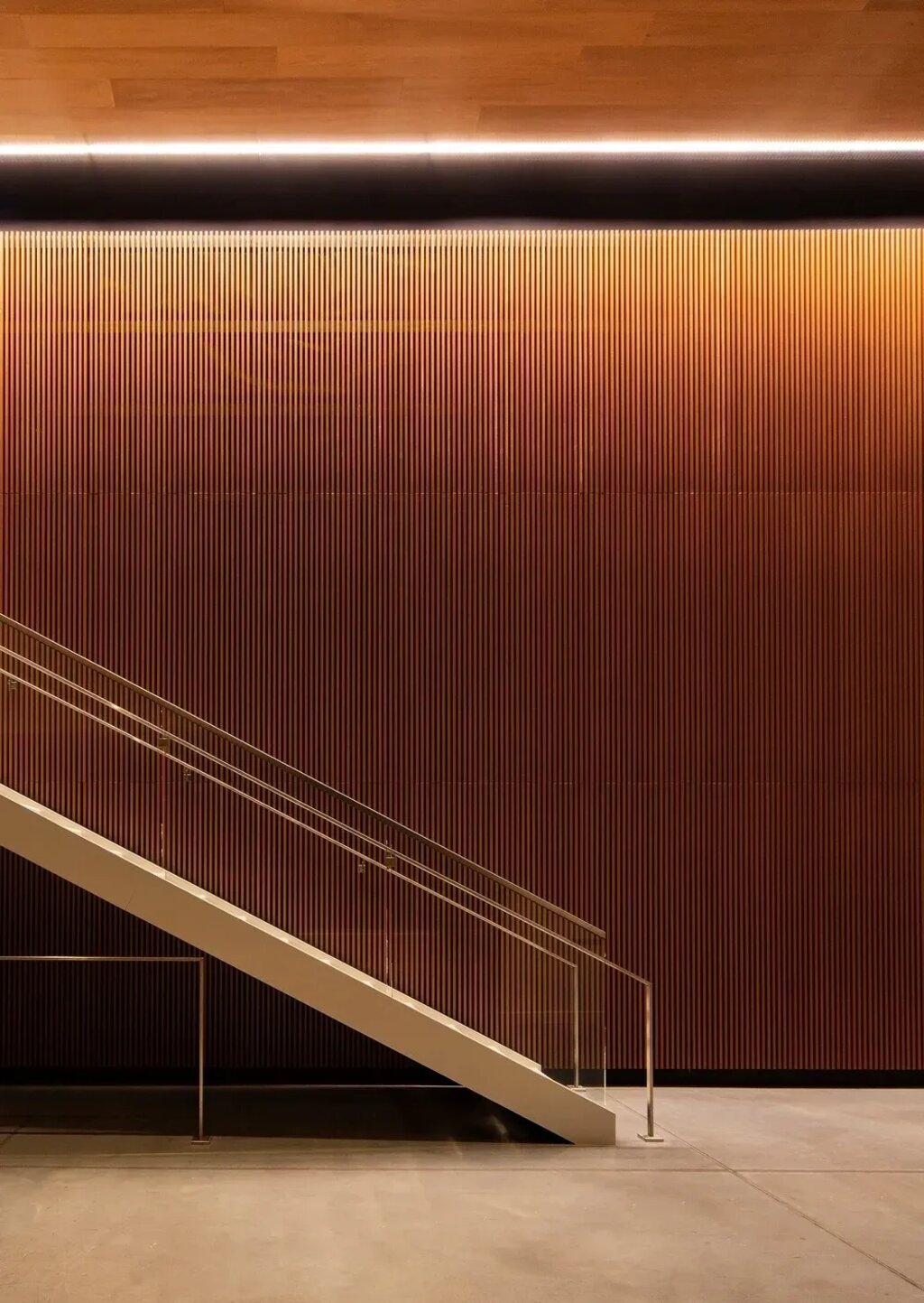 Wood is also present on the ceiling of the room’s foyer, which is a large, double-volume space opening onto the outside and featuring a stepped staircase to facilitate informal occupation and the holding of complementary activities. The room can be accessed both from the parterre and from the balcony, depending on the varied activities that can be conducted in cabaret or banquet format, in addition to the conventional configuration of the armchairs on the telescopic bleachers.