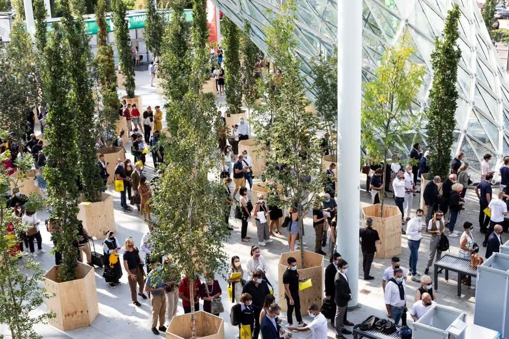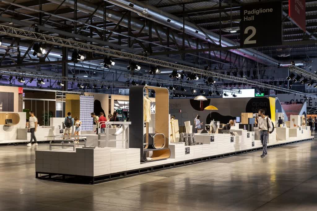 The spaces made available to the companies inside the fair were designed to ensure that the products stand out, while keeping the use of support structures to a minimum. All the materials and components of the installation conceived by Andrea Caputo – long parallel sets designed for the specific goods categories – and by Stefano Boeri Interiors – the communal areas: food courts, arenas, lounges – were achieved using a reduced quantity of chipboard panels (1,230 mc ), made from 100% recycled wood, which will then be channelled back into the production cycle with a view to circularity, saving 553,500 kilograms of CO2 from being emitted into the atmosphere.