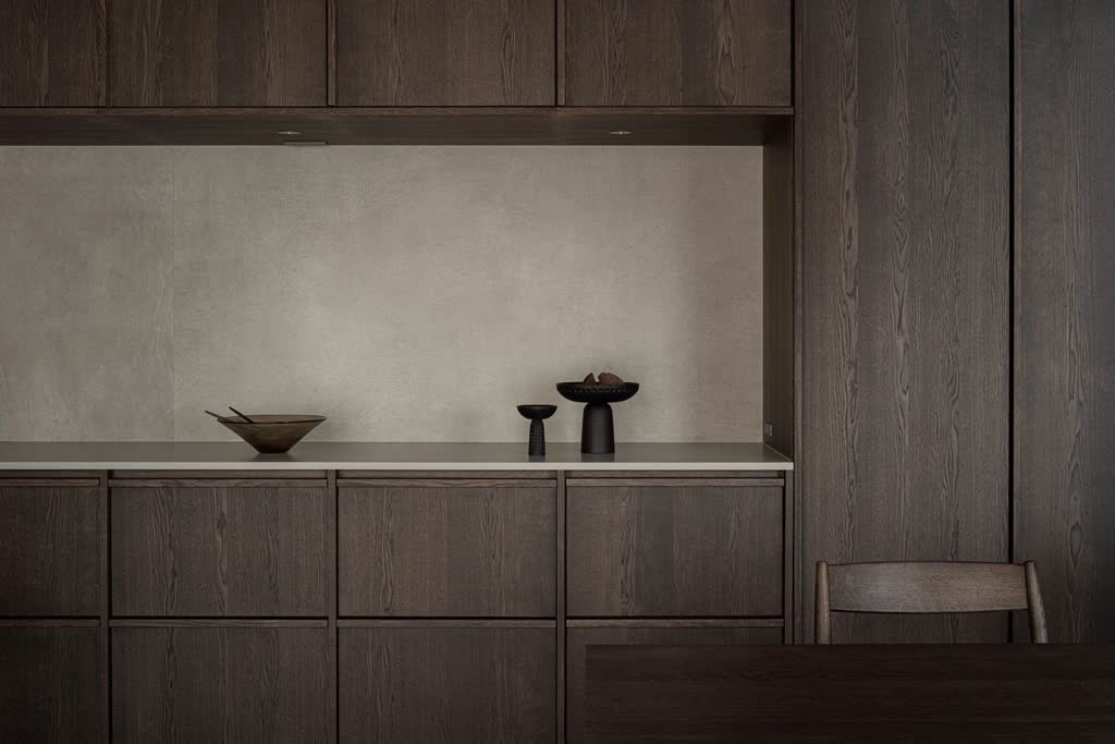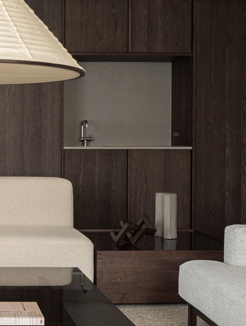 The resultant interior design is not only cozy and intimate but it also exemplifies the aura of a protective human dwelling. The implementation of a darker material scheme for furniture, flooring, walls and curtains with the use of smoked oak, a dark brown and dark wood veneers underline this impression and creates a calm and embracing interior for contemplation and private family life. Regardless of the dark tones used to unify the space, the beauty of this home stands out in the morning and early afternoon, when there is a visible contrast with the sunlight peeking into the space, and at night, when the space is filled with controlled light. For the furnishing, the two design studios selected a mixture of existing pieces from the current collection as well as created bespoke new furniture items that specifically fitted the new case.