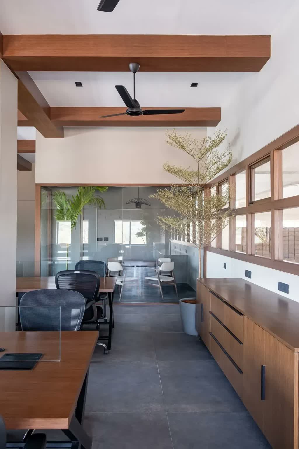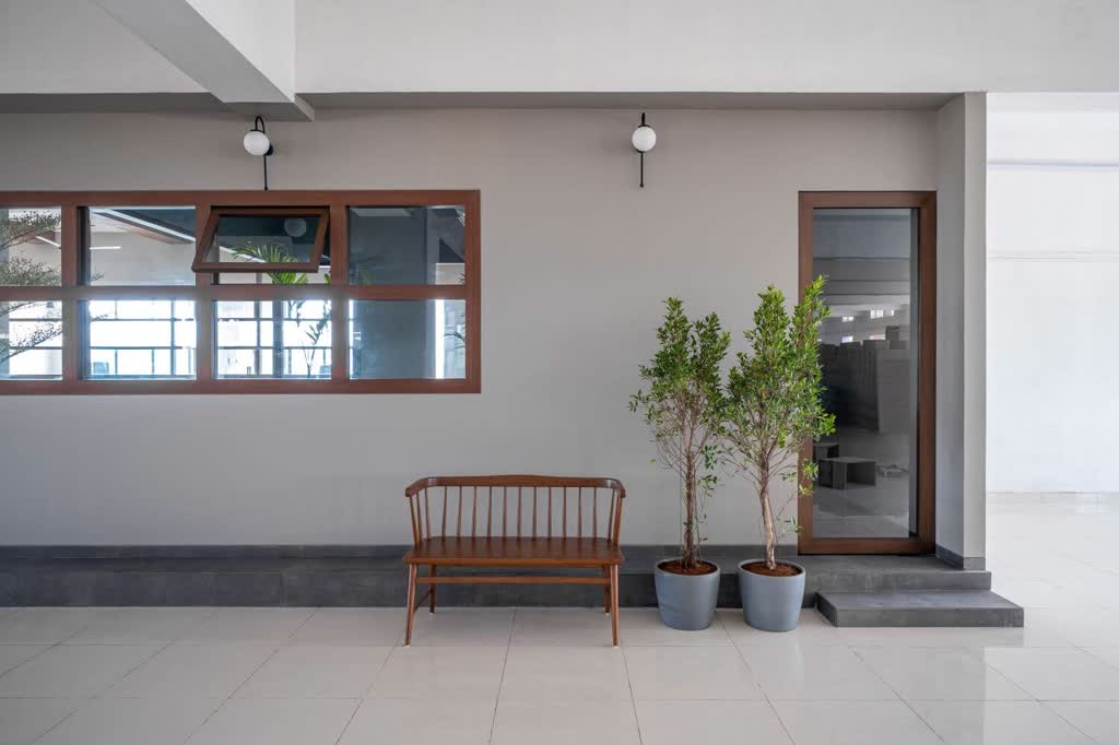 The office’s unassuming exterior façade composed of a double-tiered band of rectilinear wood and glass windows steals glimpses of the interior workspace and is speckled with modernist black and white gooseneck wall sconces, planters, and a spindled bench. Attributed to its remote location, the site often faces prolonged spells of power outages, hence the need for active air ventilation and the presence of natural light assumes pivotal importance. The windows lining the exterior elevation enable conducive flow between the factory and the office, allowing spaces indoors to maintain habitable indoor conditions during unforeseen outages.