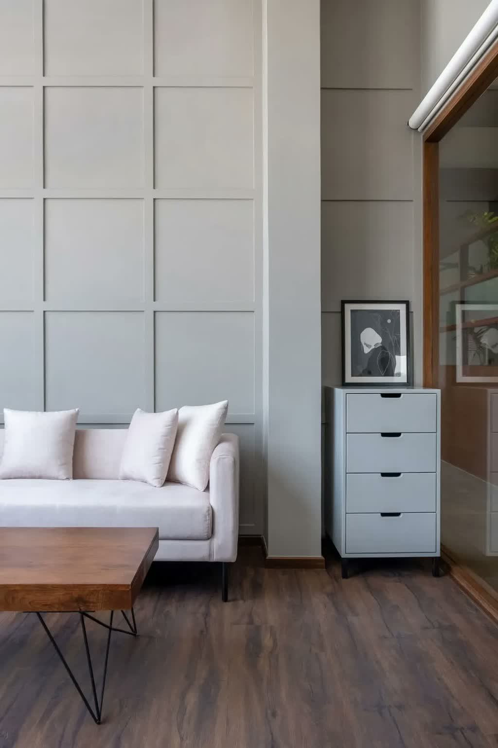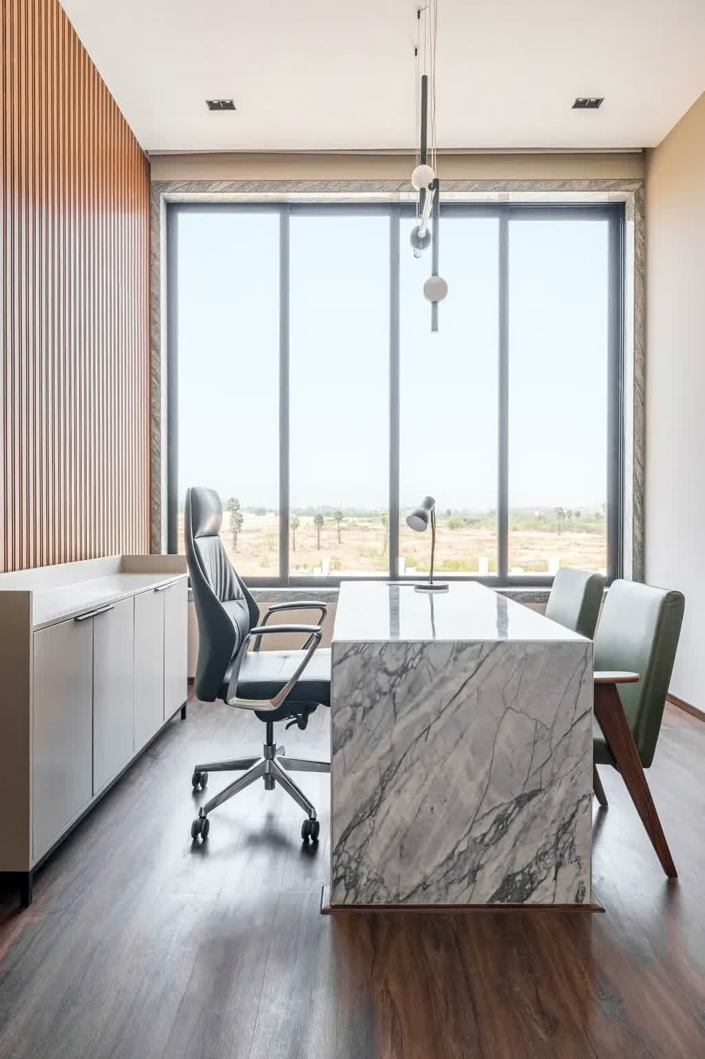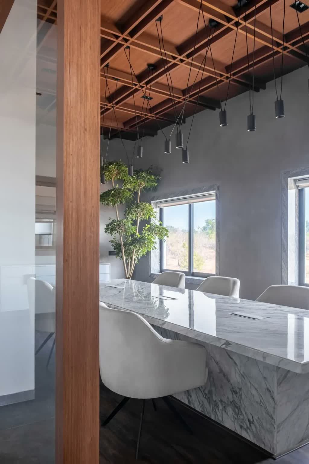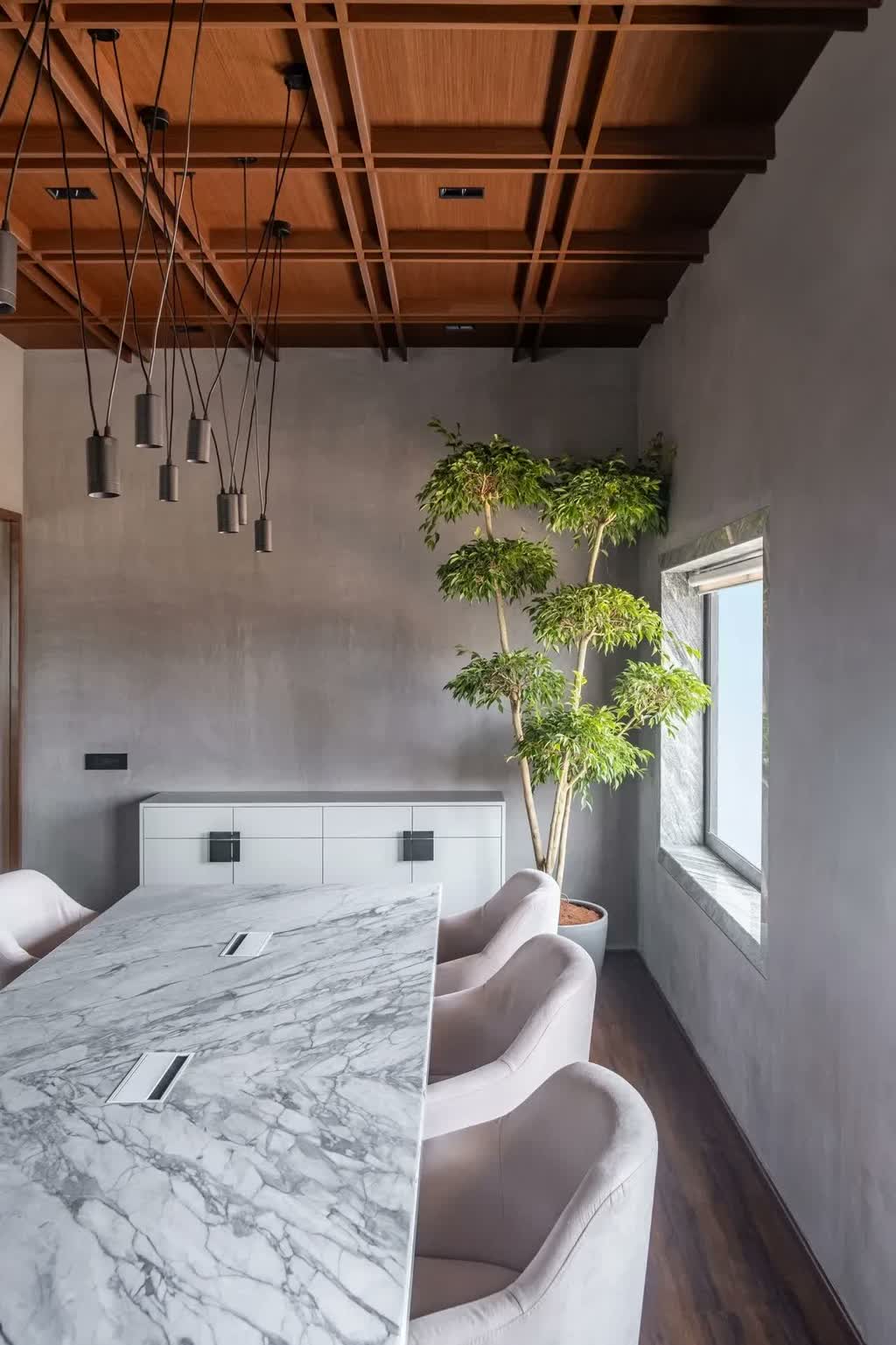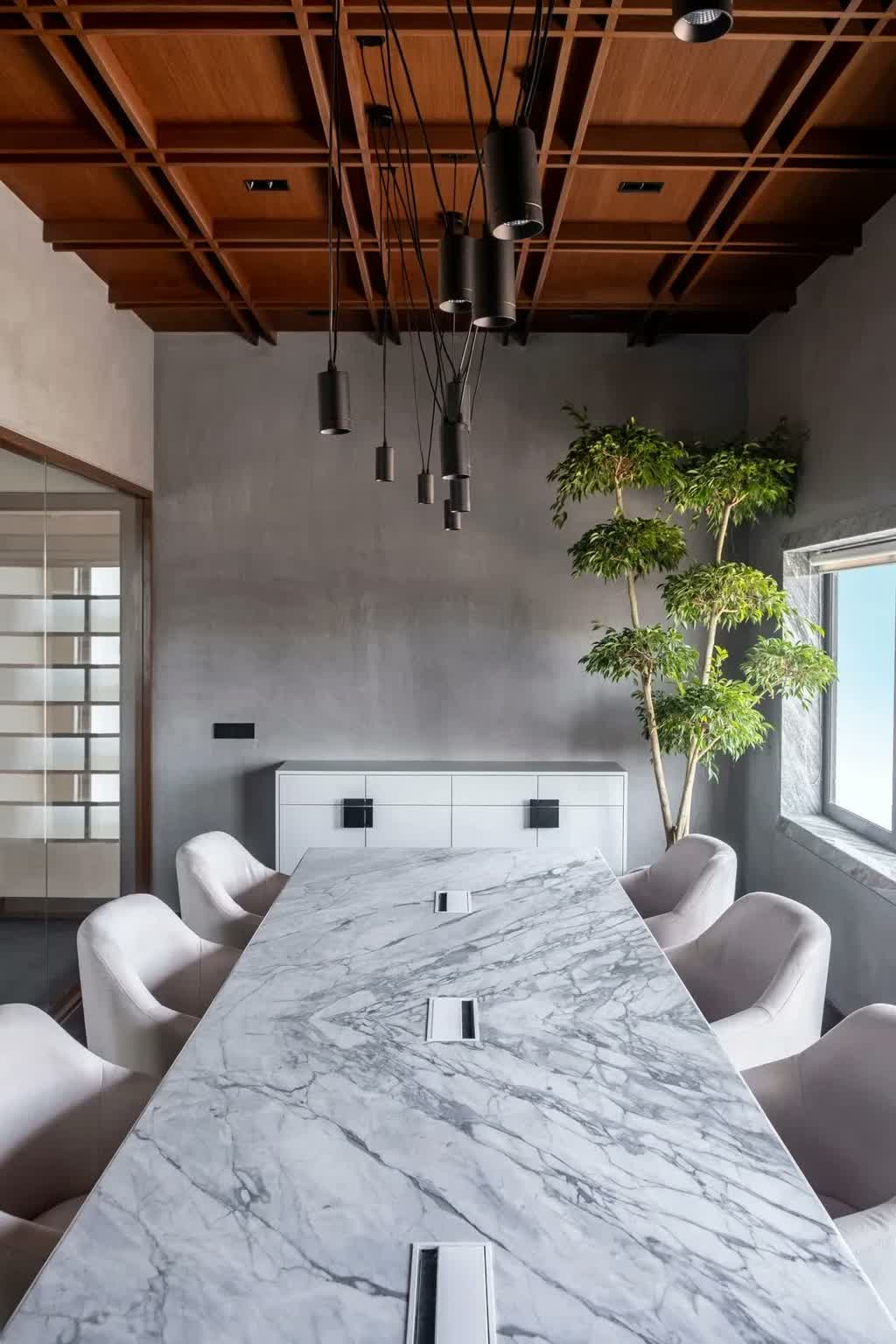 The second cabin sheaths its walls in a mild grey grid box paneling which is carried over on the opposing wall of the room. Both private cabins are peppered with marble work desks, olive-tone chairs, off-white lounge sofas, sculpturesque indoor plants, and geometric-inspired monotone task lighting. The cabins too witness the stretched-out scenic views through their ample windows that look into the surroundings.