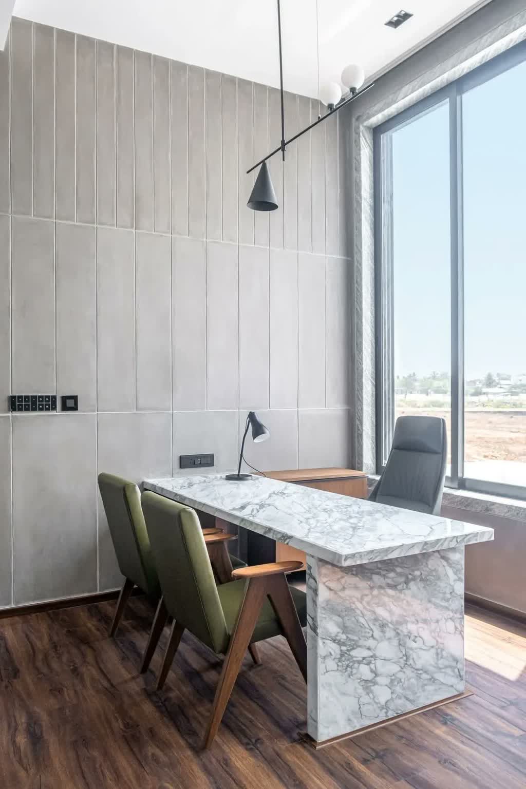 A crossover amidst modernist sensibilities and intuitive forms, the Managing Director’s cabin is set apart by its grooved wooden focal wall which poses as the backdrop to the space. A suede grey sofa dominates the lounge in the cabin, a stark marble desk rests boldly in the foreground, and is complemented by classic Jeanneret-inspired chairs in an olive hue. The desk area is canopied by a neoteric pendant that unites spherical and cylindrical forms gracefully. The cabin soaks in boundless views of the topography through its lofty fenestration whilst experiencing uninterrupted privacy.