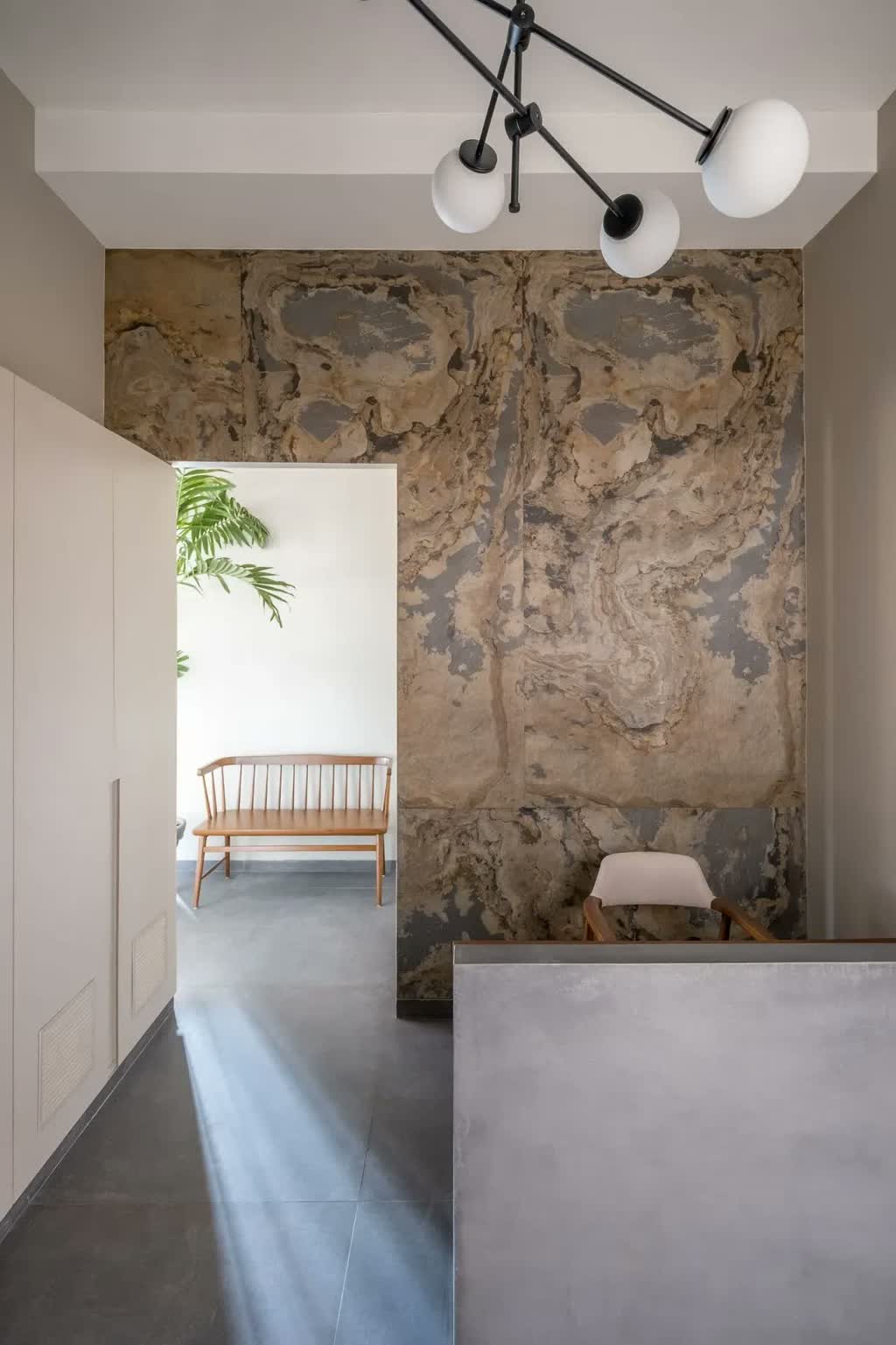 The entrance leads into the compact reception space that is framed by a stone veneer adorned by swirling marbling patterns in charcoal, grey, and browns. A monolithic concrete-body reception desk is coupled with a black and white globe cluster chandelier; this preliminary space acknowledges the ingrained design inclination of the office.