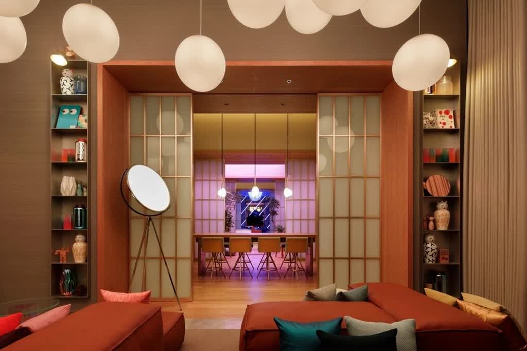 High above Osaka, on the 27th floor, the Extreme Wow suite looks out over – and beyond – the skyline of the city. Inspired by traditional Japanese homes, the suite was designed in a sequence of 5 rooms divided by deep, oak portals with sliding shoji screens that can be used to close off or open up the different rooms.